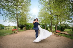 L’amour et la joie d’Adélaide et Laurent capturés dans un baiser. Cette photo de couple symbolise la romance de leur mariage au Château des Broyers, un lieu d’exception pour un jour unique. Adélaide et Laurent échangeant un baiser passionné dans les jardins du château.