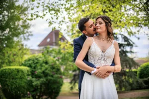 Un sourire qui en dit long. La complicité entre Adélaide et Laurent est palpable sur cette photo prise lors de leur séance couple. Leur bonheur illumine cette belle journée de mariage au Château des Broyers. La mariée Adélaide souriant à son époux Laurent devant l’architecture du Château des Broyers.