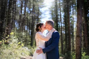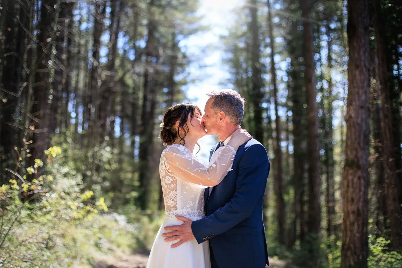 Un instant de complicité capturé lors de la balade de Nathalie et Pascal sur les collines de Ceyzeriat. La lumière douce d’avril met en valeur la joie des nouveaux mariés. Une séance photo réalisée par Greg BELLEVRAT leur photographe de mariage dans l’Ain. Les mariés Nathalie et Pascal marchant main dans la main dans un paysage printanier à Ceyzeriat.